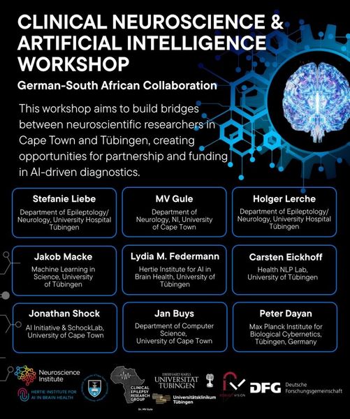 The workshop focused on research at the intersection of clinical neuroscience and AI, featuring a series of talks by researchers from the Universities of Tübingen and Cape Town. Presentations provided insights into the application of AI in epilepsy research at both sites, discussed challenges in translating natural language processing into clinical practice, and highlighted unique perspectives on large language models in African languages. Subsequent talks explored how AI can be applied beyond predictive tasks, including generating mechanistic insights in neuroscience, identifying subgroups within cognitive aging trajectories, and modeling brain-behavior relationships. In addition, the African AI Initiative was introduced, offering an inspiring perspective on how Africa can contribute to the global AI research landscape.